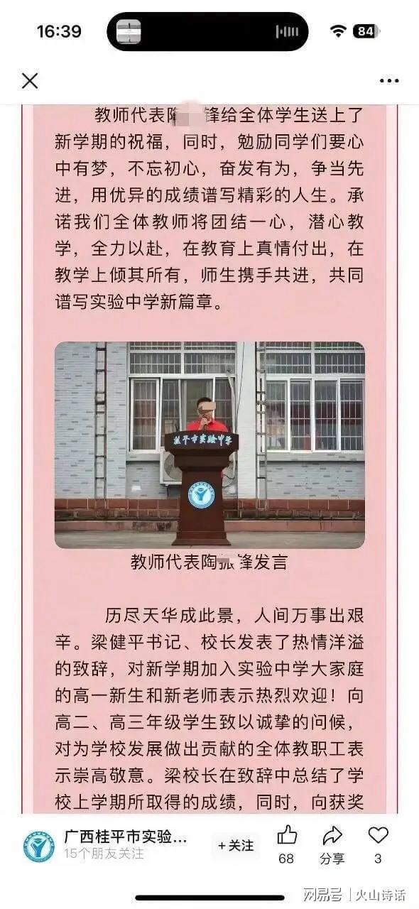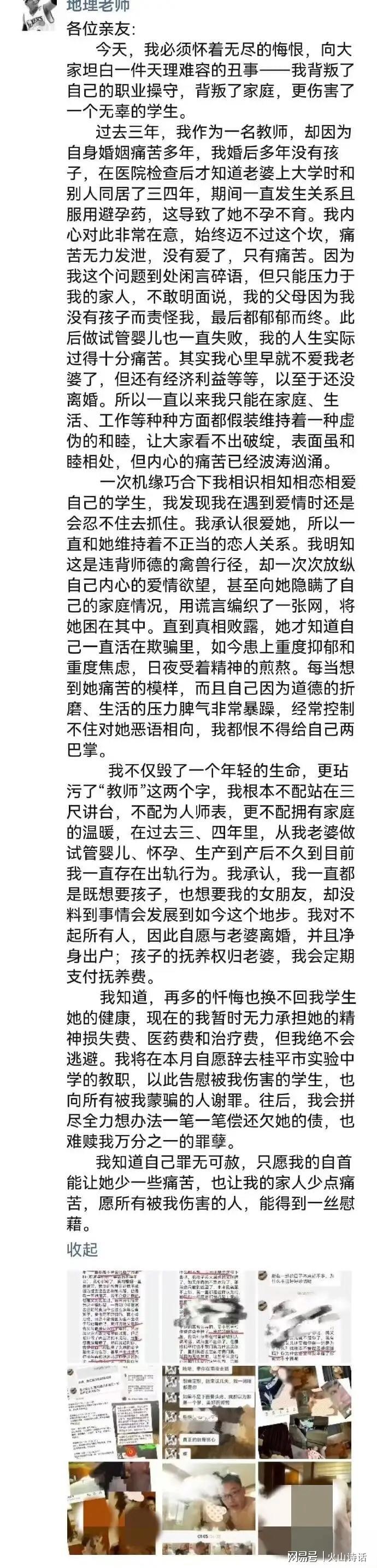 近日,广西桂平市实验中学一男性教师在朋友圈发文,自述与女学生存在不正当关系。引发网络关注。