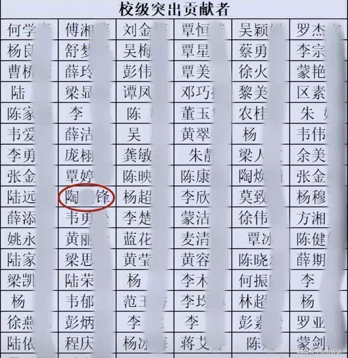 另外一份名单显示,陶某锋还是学校的突出贡献者,和其他优秀老师一道成为学校的教育教学骨干力量。