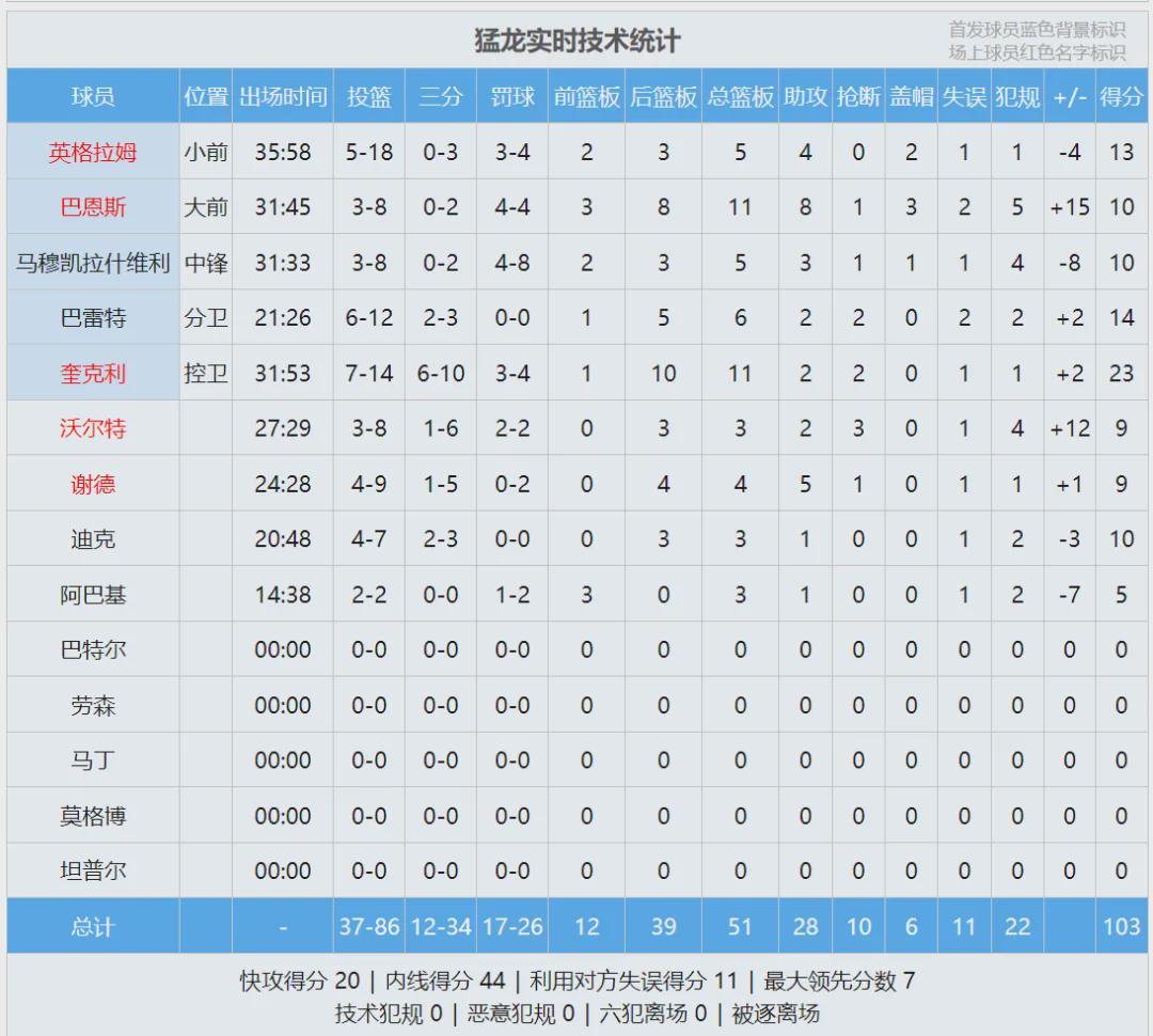 末节最后13秒,猛龙队贾马尔-谢德居然两罚不中,幸亏巴恩斯把前场篮板拍到奎克利手里。奎克利2罚2中,帮助猛龙锁定胜局。全场比赛,奎克利投篮14中7,三分10中6,罚球4中3,砍下23分11篮板2助攻2抢断,得分全队最高。