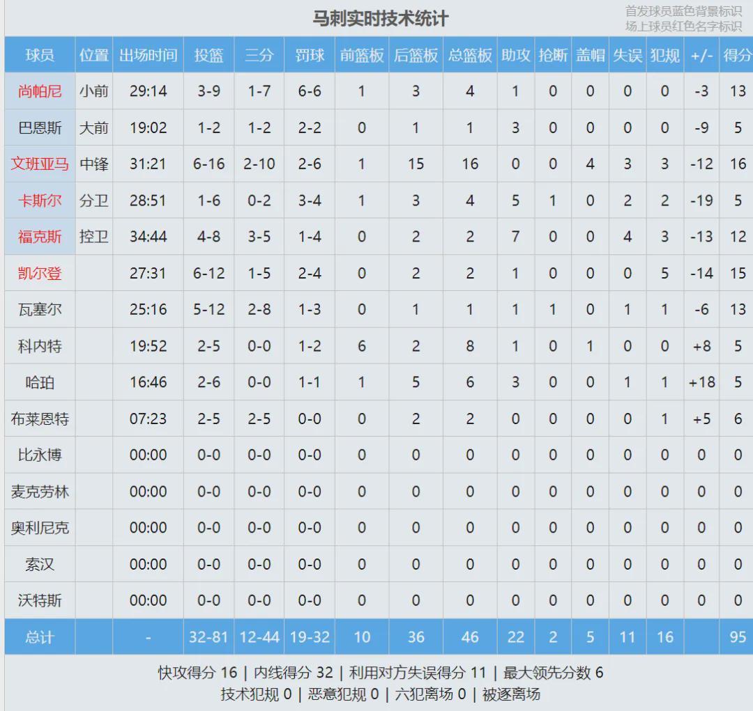 四节比分(鹈鹕在前):25-28、31-19、26-21、22-27。第四节马刺轰出一波24-5,一度完成反超。但鹈鹕还了一波13-0,直接带走比赛胜利。福克斯8中4得到12分7助4失误,罚球4中1;卡斯尔投篮6中1仅得5分4板5助2失误。